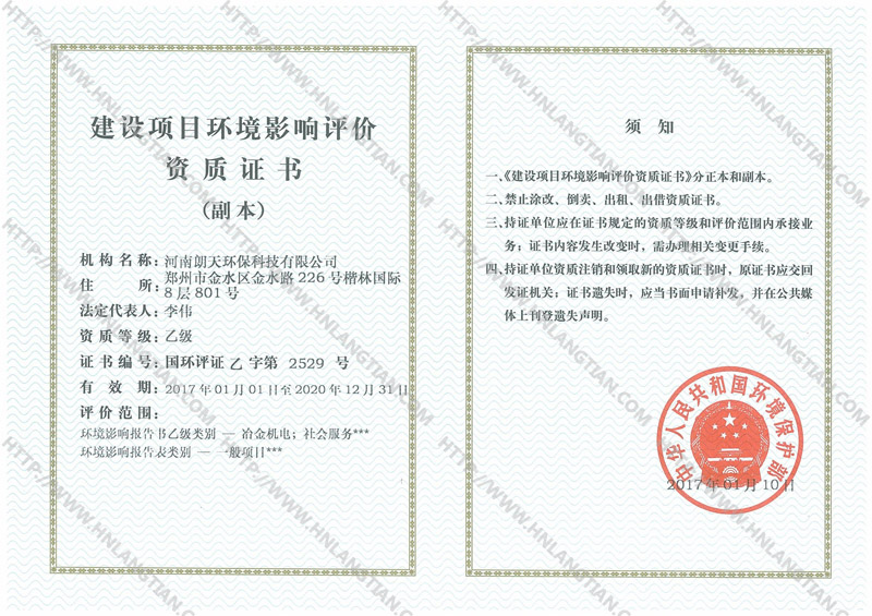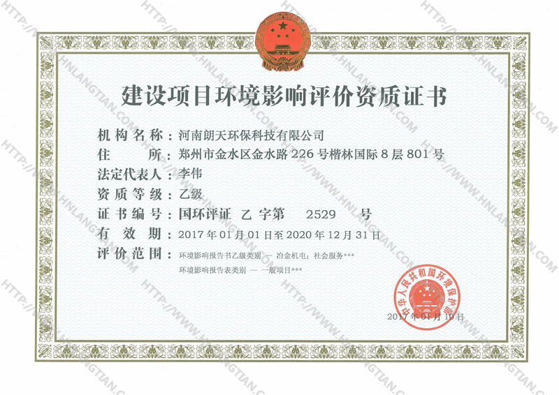 河南朗天環??萍加邢薰荆瓰楹幽限r大風景園林規劃設計院環境研究所,于2005年6月30日正式取得由國家環境保護部頒發的環境影響評價乙級資質證書(國環評乙字第2529號),注冊地址鄭州市金水區金水路226號楷林國際8層801號,注冊資金500萬元。主要從事環境影響評價、環保技術咨詢、土壤環境調查、第三方環境監查及督導、竣工環境保護驗收、突發環境事件應急預案、區域環境現狀評估、排污許可申報、清潔生產審核、環境工程治理、空氣質量精細化管控(專家組)等。公司在“以質量求生存、以信譽求發展”經營理念的指導下,秉承改善人類環境、實現最佳經濟效益與環境效益之宗旨,倡導科技創新之精神,依托雄厚的技術力量,致力于環境影響評價工作及環境工程技術咨詢的科研工作。